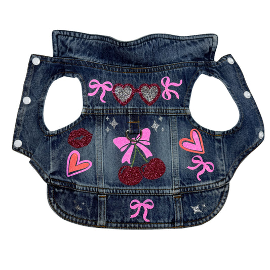 Handmade Dog Harness – Cherry Denim Jacket Style